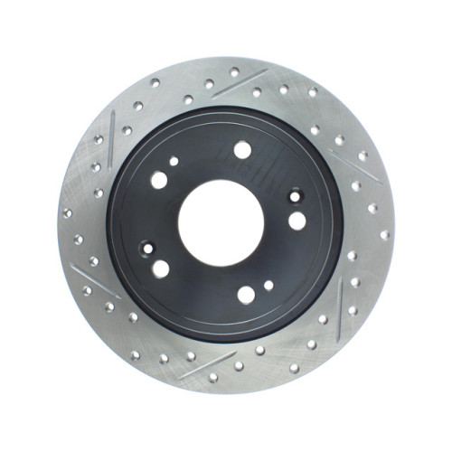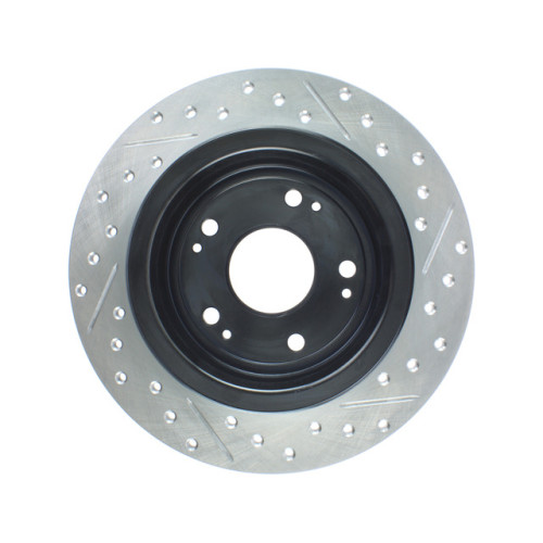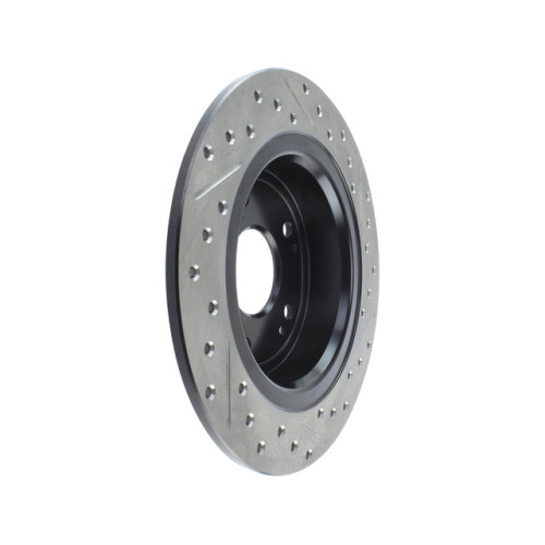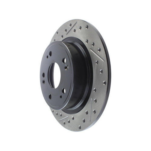 StopTech Drilled and Slotted Sport Rotors are 1-piece direct replacement brake rotors for factory brake systems and stock calipers.  These rotors offer significantly improved braking performance over the OEM rotor. The unique cross-drilling and slotting aids with heat and brake dust dispersal, prevents glazing of the pads, adds bite and improves wet and dry braking performance. Built to last, the black e-coating provides protection from corrosion and the high carbon metallurgy (in most applications) offers quieter operation, better crack resistance and increased performance.