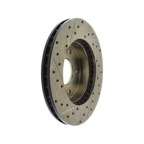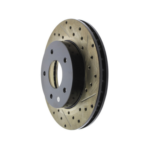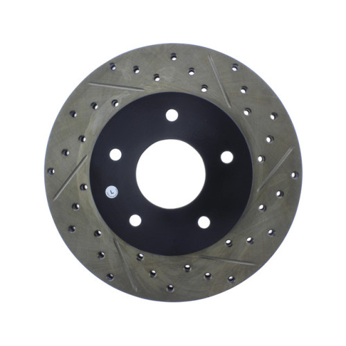 StopTech Drilled and Slotted Sport Rotors are 1-piece direct replacement brake rotors for factory brake systems and stock calipers. These rotors offer significantly improved braking performance over the OEM rotor. The unique cross-drilling and slotting aids with heat and brake dust dispersal, prevents glazing of the pads, adds bite and improves wet and dry braking performance. Built to last, the black e-coating provides protection from corrosion and the high carbon metallurgy (in most applications) offers quieter operation, better crack resistance and increased performance.