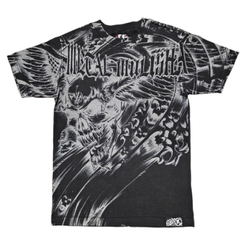 Metal Mulisha Men's Banshee Tee in Black features a printed front with Skull & Wings design and large "Metal Mulisha" font in Grey on Black background.