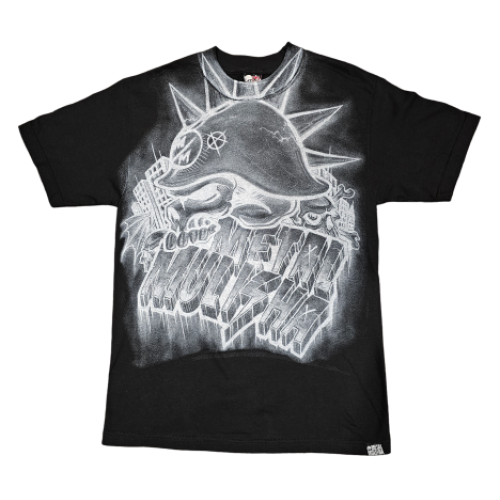 Metal Mulisha Misfit Men's Tee in Black features a printed front with Metal Mulisha OG Helmet insignia and large "Metal Mulisha" font in White on Black background.