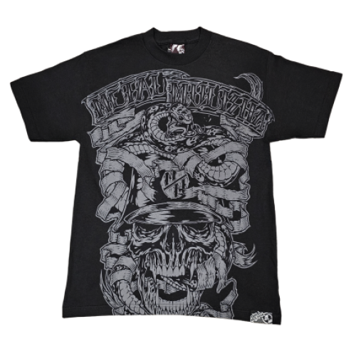 Metal Mulisha Men's Serpent Tee in Black features a printed front with Skull & Helmet entwined with Serpent design and large "Metal Mulisha" font in Grey on Black background.