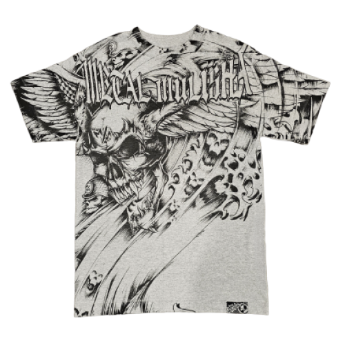 Metal Mulisha Men's Banshee Tee in Grey features a printed front with Skull & Wings design and large "Metal Mulisha" font in Black on Grey background.
