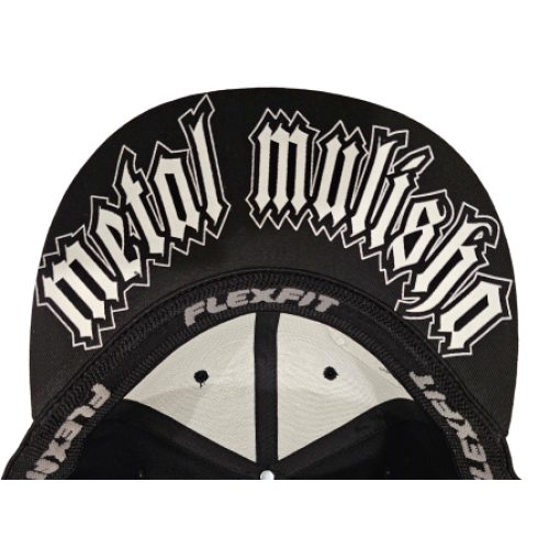 The Metal Mulisha Shocker Flex Cap in Black features a Medium Metal Mulisha embroidery on the front panel in white with white "shockwave" stitching and custom printed "Metal Mulisha" wording in white on the underbill.